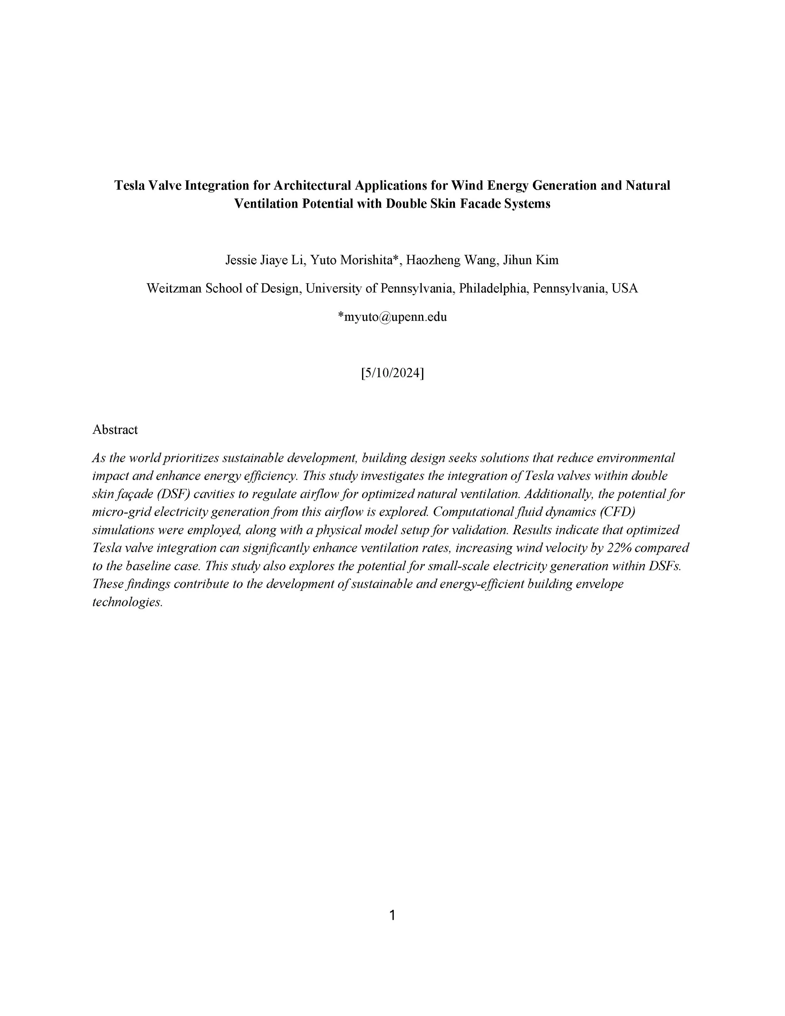 As the world prioritizes sustainable development, building desian seeks solutions thateduce environmental impact and enhance energy efficiency. This study investigates thentegration of Tesla valves within double skin facade (DSF) cavities to regulate airflow foroptimized natural ventilation. Additionally, the potential for micro-grid electricity genera.tion from this airflow is explored. Computational fluid dynamics (CFD) simulations weremployed, along with a physical model setup for validation. Results indicate that optnized Tesla valve intearation can sianificantly enhance ventlation rates, increasing wincvelocity by 22% compared to the baseline case. This study also explores the potential fosmall-scale electricity generation within DSFs. These findings contribute to the develop.ment of sustainable and energy-efficient building envelope technologies
