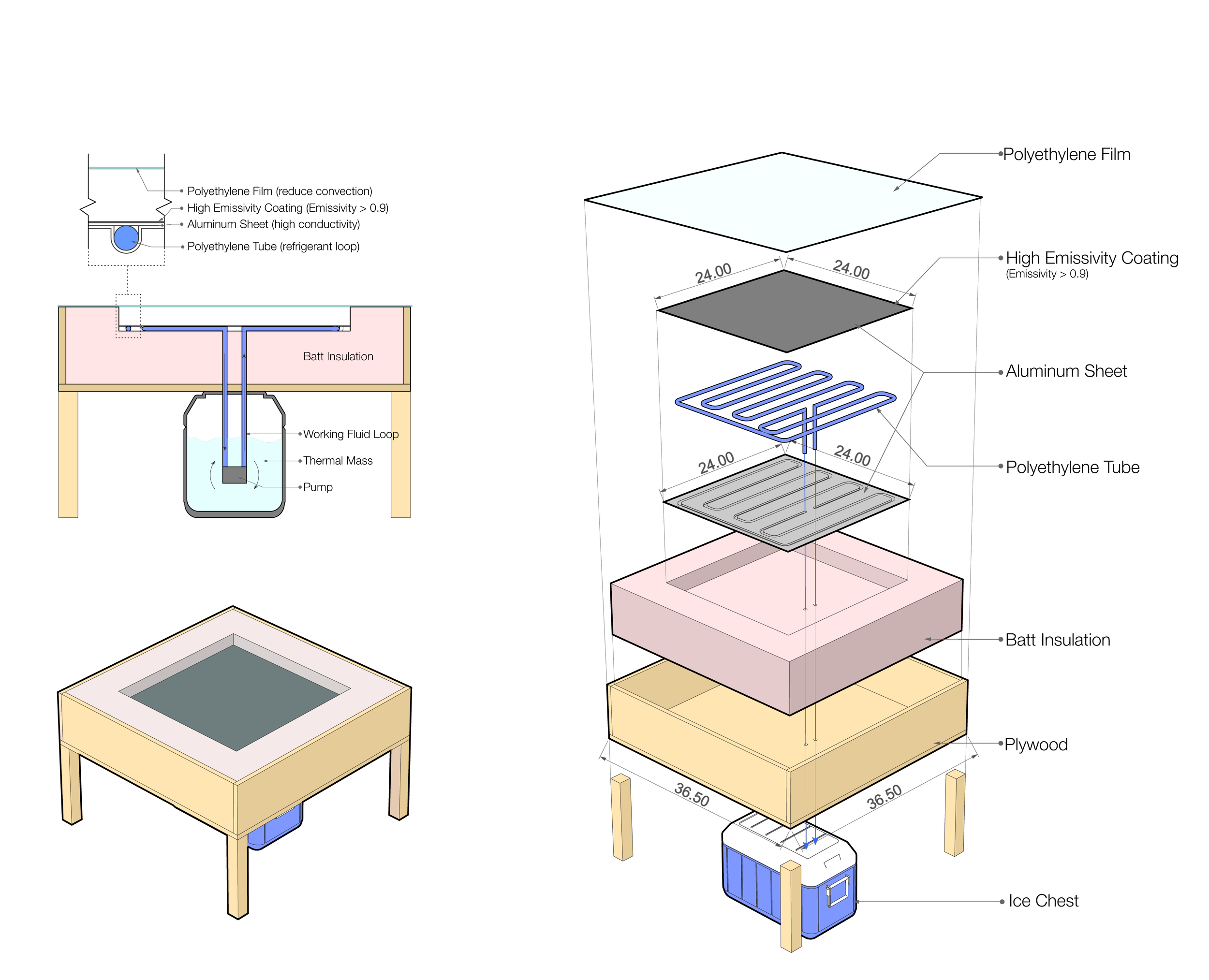 The emitter is enclosed in a wooden container insulated with multiple layers of batt insulation to reduce external heat gain, and a polyethylene film atop the system further minimizes convective heat transfer. The thermal storage unit, consisting of five gallons of water housed in an insulated ice chest, is designed to minimize heat exchange with the environment. Connected to the emitter through the working fluid circuit, this configuration ensures consistent heat transfer and stable operation, making the system both efficient and reliable for sustainable cooling.